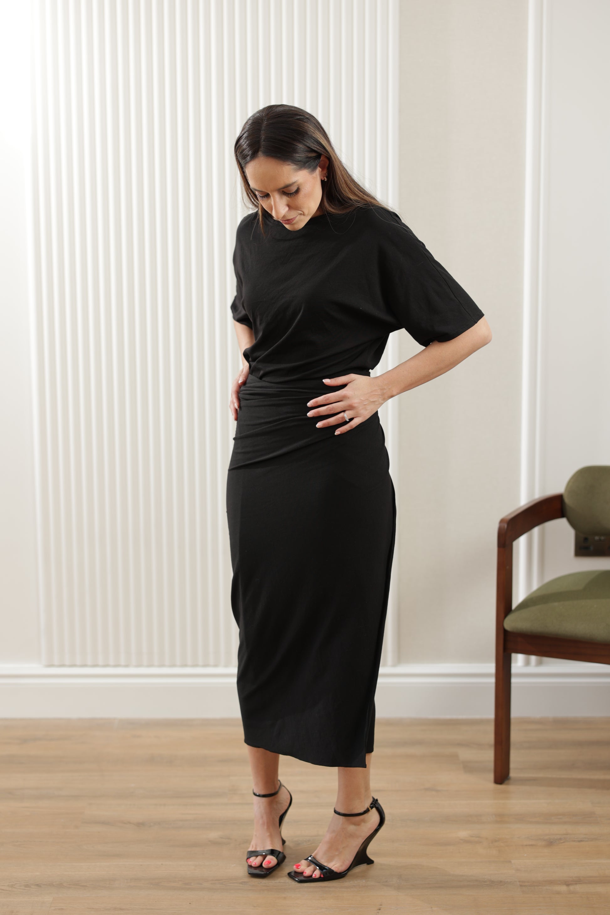 Soft jersey, clean line and a neckline that knows how to flatter, this midi dress is designed for understated impact. Easy to wear and perfect for summer season.